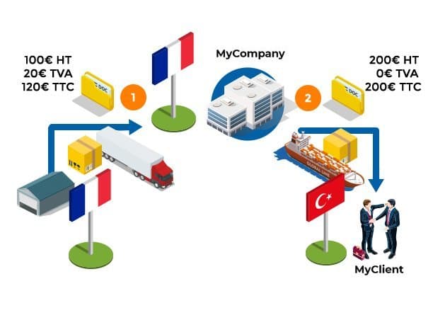 Prenons l’exemple d’une société française qui achète des marchandises auprès d’un fournisseur (B2B) et revend ces marchandises à un particulier (B2C) :
