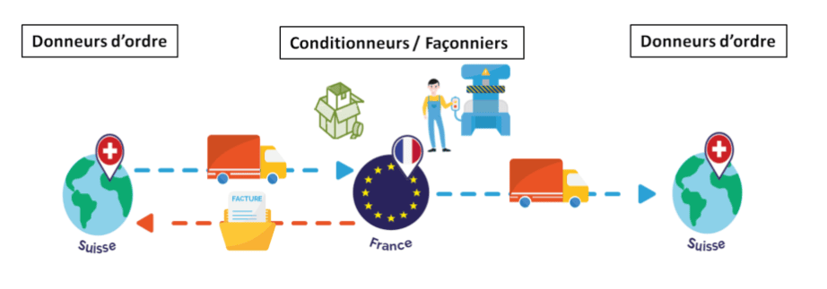 Une société française assujettie, établie et identifiée à la TVA en France, effectue du conditionnement ou du travail à façon. Les donneurs d’ordre suisses, livrent en France des matières premières pour conditionnement ou travail à façon. Après avoir réalisé sa prestation, le conditionneur ou façonnier français livre les marchandises (des produits finis ou semi-finis) chez son donneur d’ordre en Suisse.