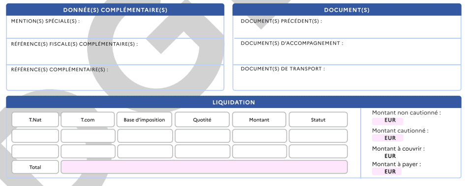 Cette rubrique permet notamment de mentionner la garantie utilisée dans le cadre du crédit d’enlèvement des marchandises, condition nécessaire à leur mise en libre circulation.