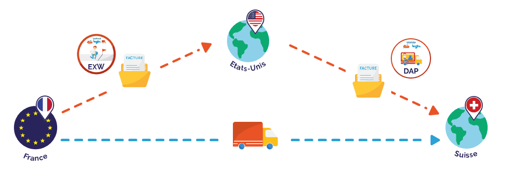 L’entreprise américaine réalise du négoce international et achète auprès de fournisseurs français des lots de marchandises qu’elle revend à une société Suisse. Les incoterms utilisés sont, à l’achat EXW et à la revente DAP.