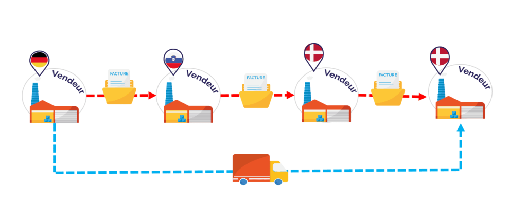 Dans l’affaire examinée, un fournisseur établi en Allemagne a vendu des biens à une société établie en Slovénie. Cette dernière les a ensuite revendus à une société danoise, qui les a elle-même revendus à son client final, également établi au Danemark. Les biens ont fait l’objet d’un transport unique directement depuis le premier fournisseur allemand vers le client final danois, quatrième opérateur de la chaîne.