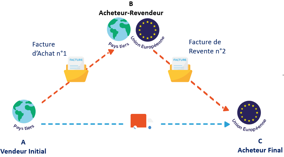 Ce schéma est courant dans le négoce international, notamment pour les distributeurs ou traders qui achètent et revendent sans que les biens ne transitent physiquement par leur pays d’établissement.
